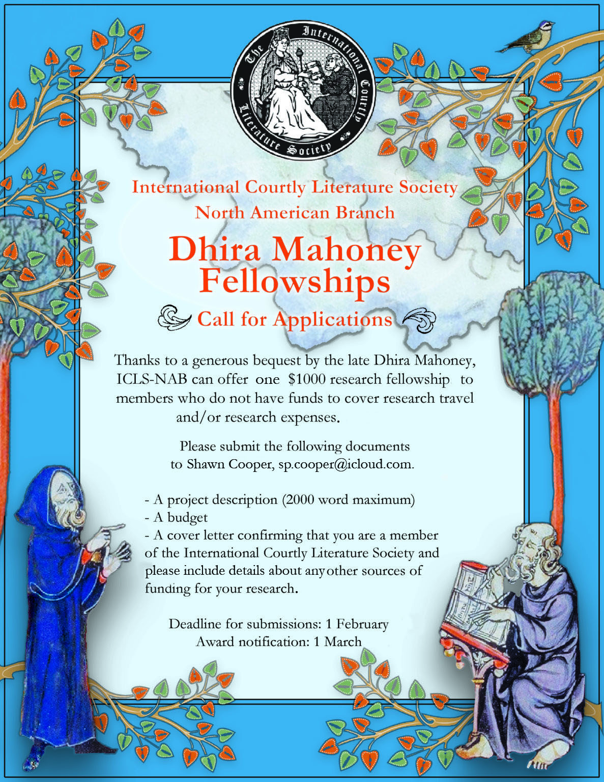 Thanks to a generous bequest by the late Dhira Mahoney, ICLS-NAB can offer one $1000 research fellowship to members who do not have funds to cover research travel and/or research expenses. Please submit the following documents to Shawn Cooper (sp.cooper@icloud.com).